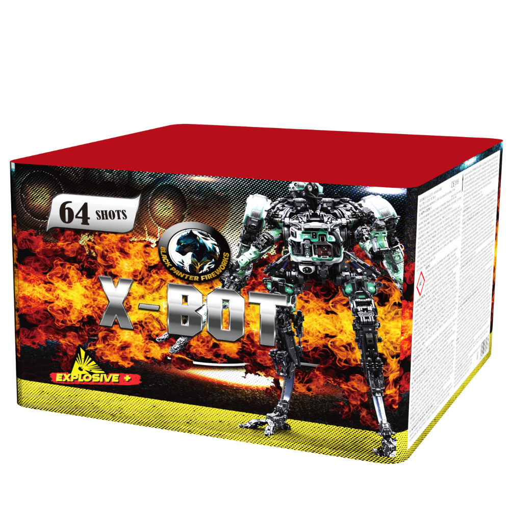Kompaktní ohňostroj X-BOT je doprovázený mnoha různobarevnými efekty. Do vzduchu vypálí 64 ran ráže 30 mm, celá show trvá 110 vteřin.