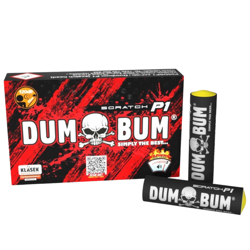 Toto balení zábavní pyrotechniky obsahuje 20 kusů petard Dum Bum se škrtací hlavičkou.